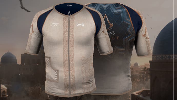 L’azienda di aptica Owo ha creato un tie-in a tema Mirage in collaborazione con Ubisoft e si presenta come una maglietta a maniche corte estremamente aderente, anche se confezionata insieme a vari componenti hardware. Indossandola, i giocatori possono provare “molteplici sensazioni diverse” che riflettono quelle del protagonista di Assassin’s Creed Mirage, Basim.